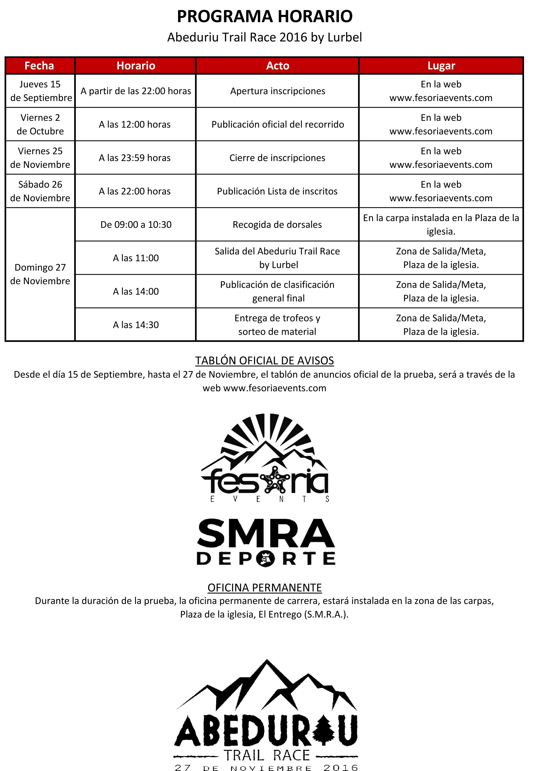El tiempo máximo establecido para completar el recorrido será de 2h30 minutos, tiempo que trataremos de flexibilizar en la medida de lo posible, siempre y cuando no posponga en exceso la entrega de premios.
