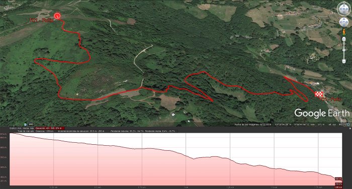 Este tramo se puede considerar como el más mítico de las pruebas organizadas por Fesoria Events en todos estos años, es sin duda un clásico y combina varias zonas distintas que lo hacen duro fisicamente y en su parte final técnicamente. Su comienzo, en una zona combinada de curvas en bajada con buenos apoyos, hasta llegar a una curva muy cerrada de derechas que nos llevará a una sección totalmente nueva abierta para la ocasión, a continuación nos reincorporamos a la versión más clásica, cogiendo la parte final de la caleya ultrarápida antes de entrar en el punto que más factura pasa a todos los pilotos y que no es otro que el largo pedaleo que en su parte intermedia tiene este tramo y que lo hace tan completo y complejo a la vez. Tras el llaneo, un vertiginoso descenso por una zona de sendero, bosque y por último la mítica caleya de piedra que en mojado hace realmente complicado el ir rápido por ella.