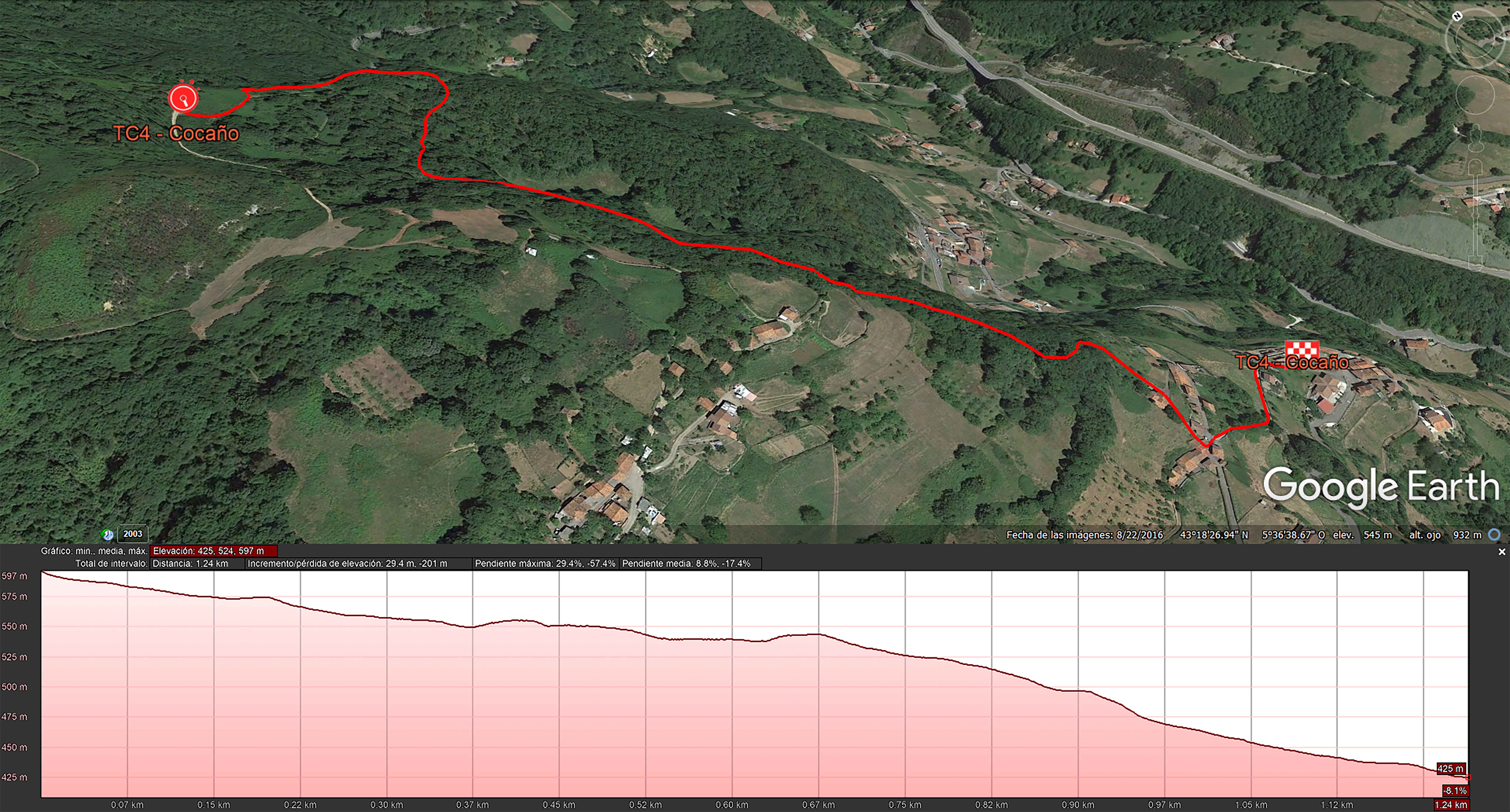 El tramo comienza en una pista rapida para a continuación y tras una cerrada curva a derechas, acceder a una zona de bosque precioso en donde hilar fino se hará imprescindible para pasar sin problemas, tras el paso del salto del muro y el estrecho sendero que serpentea a continuación entraremos en una zona preparada para la ocasion y totalmente inédita que nos enlaza con la parte intermedia de Cocaño, nos adentramos en un camino que trás más de 20 años abandonado hemos recuperado para la ocasión y que es a partes iguales fluído y exigente. La parte final nos llevará hasta el centro neurálgico de la prueba, justo delante de la iglesia de Cocañín.