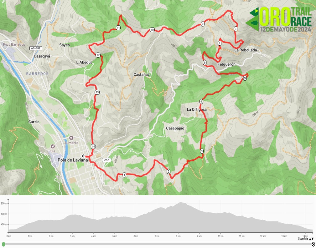 El recorrido del Oro Trail Race 2024 consta de una distancia de 14, 3 kms. y 725 mts. de desnivel positivo. La prueba se desarrolla por un trazado que combina pistas de tierra y senderos en las justas proporciones, logrando un recorrido muy compensado y sin unos desniveles muy marcados, pero con lugares de paso, con un nivel paisajístico muy interesante y que para los foráneos servirá para poder conocer de cerca gran parte de la orografía del concejo , siendo los más destacados la Sierra de Peña Mayor, debajo de la cual alcanzaremos el punto de máxima altitud de la prueba en torno al kilómetro 8, pero además, podremos observar la imponente cima de Peña Mea, la montaña de mayor envergadura de la zona.